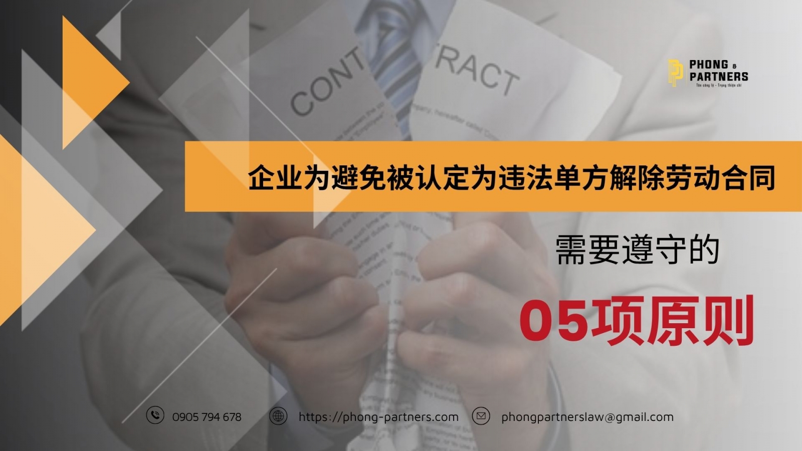 以上即为企业在行使单方解除劳动合同权时需要注意遵守的 05项原则,以避免被认定为违法,从而降低争议风险及可能产生的赔偿义务。如需进一步咨询或解答,敬请贵企业通过电话 02363.822.678 或热线 0905.503.678 联系 Phong & Partners 律师事务所,我们的律师团队将及时并高效地为您提供支持。