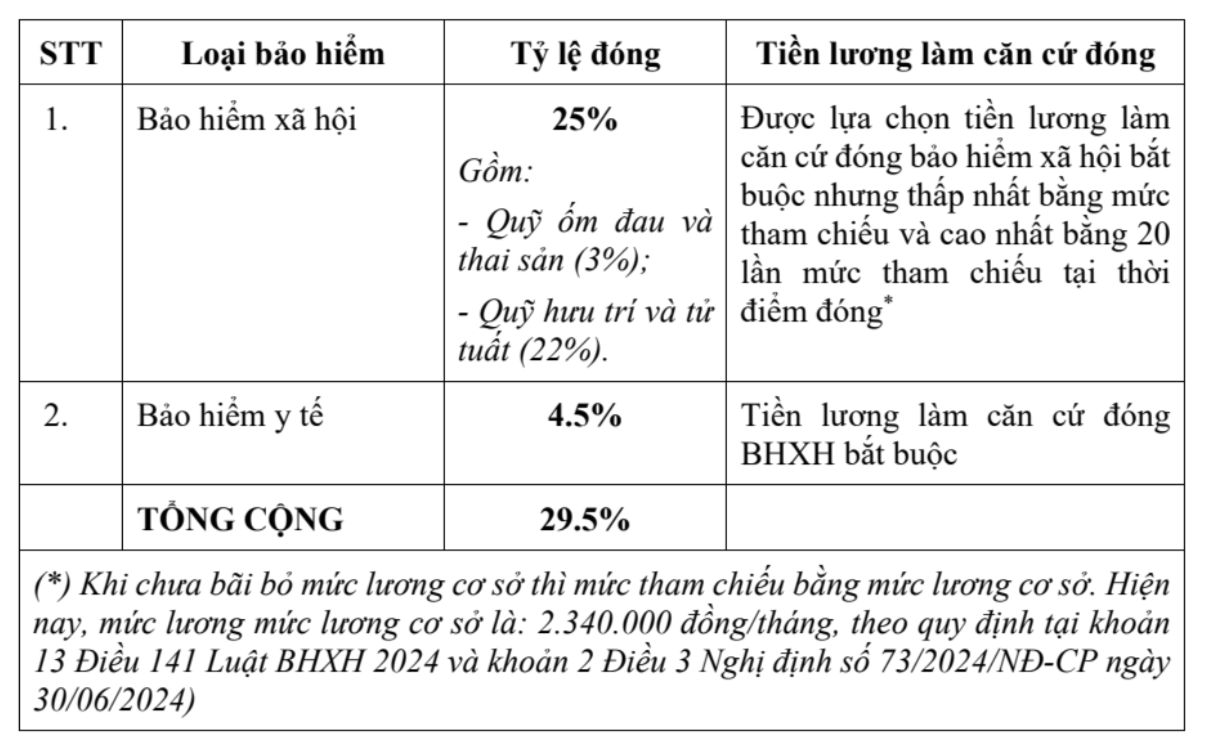 Mức đóng bảo hiểm xã hội bắt buộc trong trường hợp này là 25% tiền lương làm căn cứ đóng BHXH. Trong đó bao gồm: 3% tiền lương vào quỹ ốm đau và thai sản; 22% tiền lương vào quỹ hưu trí và tử tuất theo quy định tại điểm a khoản 4 Điều 33 Luật BHXH 2024.