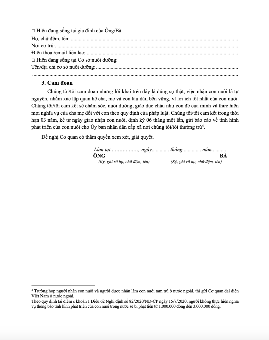 Lưu ý: Trong thời gian 3 năm, kể từ ngày hoàn tất thủ tục nhận nuôi con nuôi, cha mẹ nuôi phải báo cáo đến UBND xã nơi thường trú theo định kỳ 6 tháng một lần về: