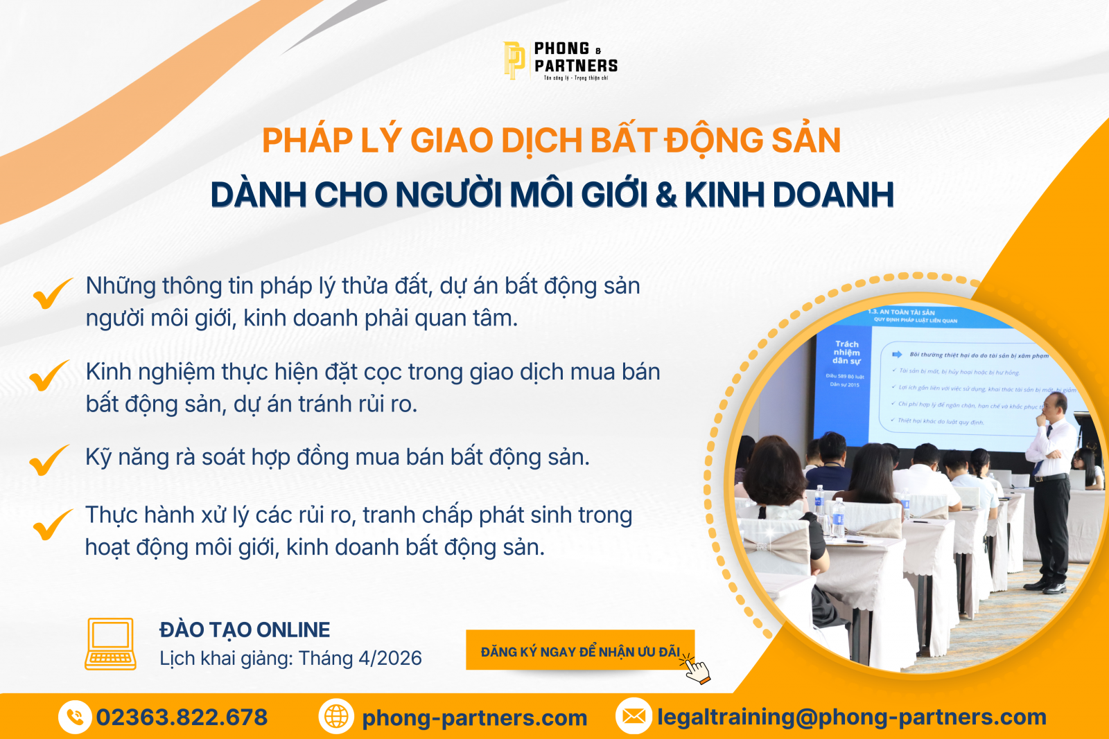 Khóa đào tạo tại Phong & Partners trang bị tư duy pháp lý cốt lõi và kỹ năng kiểm soát rủi ro thực tế cho người kinh doanh Bất động sản. Chương trình giúp học viên chủ động phòng ngừa tranh chấp, giảm thiểu trách nhiệm pháp lý và hành nghề một cách chuyên nghiệp, an toàn.