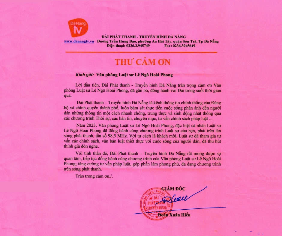 Với tinh thần đó, Đài Phát thanh – Truyền hình Đà Nẵng rất mong được sự quan tâm, tiếp tục đồng hành cùng chương trình của Văn phòng Luật sư Lê Ngô Hoài Phong; tăng cường tư vấn pháp luật, góp phần làm phong phú, đa dạng chương trình trên sóng phát thanh.