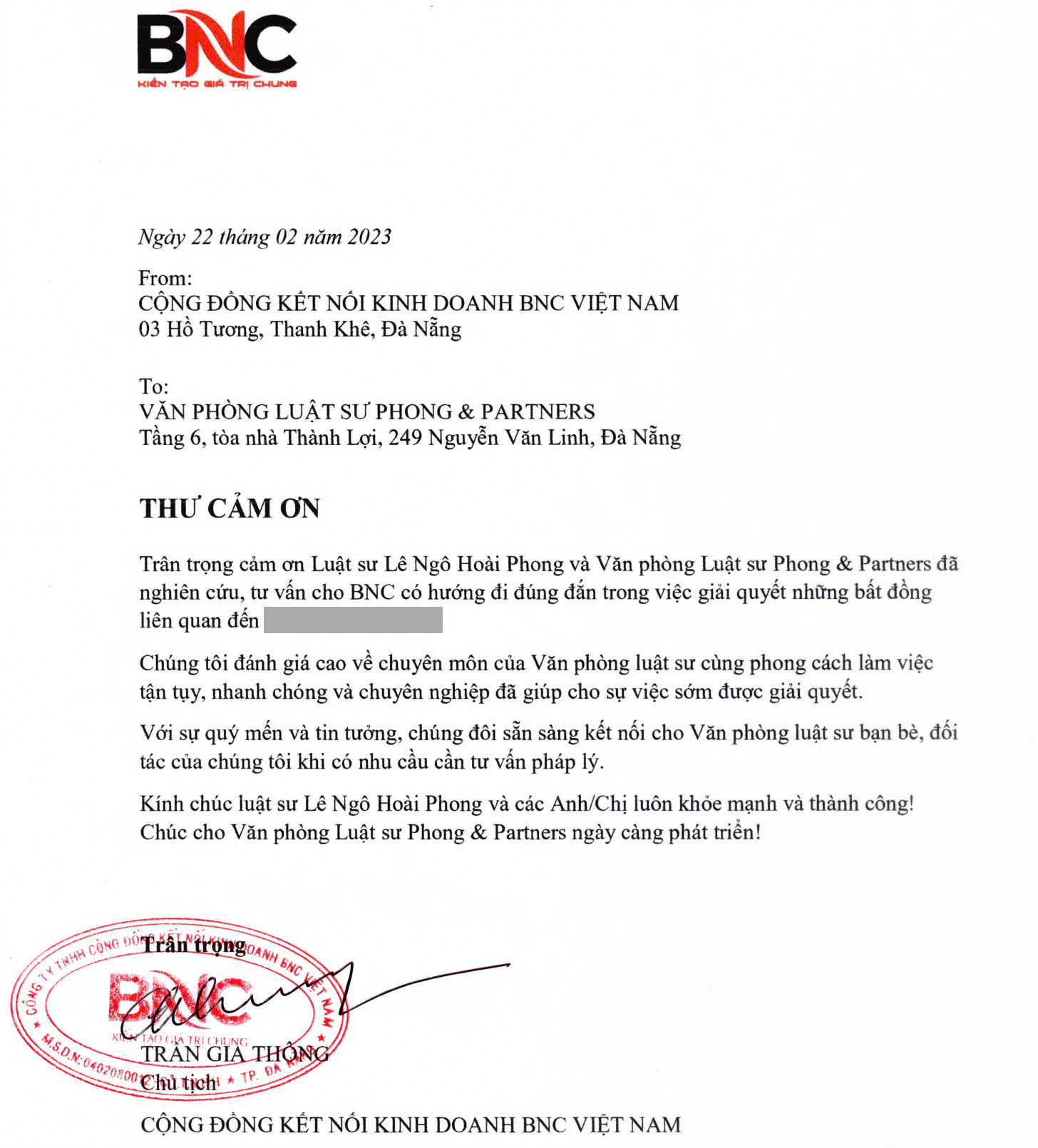 “Chúng tôi đánh giá cao về chuyên môn của Văn phòng luật sư cùng phong cách làm việc tận tụy, nhanh chóng và chuyên nghiệp đã giúp cho sự việc sớm được giải quyết.