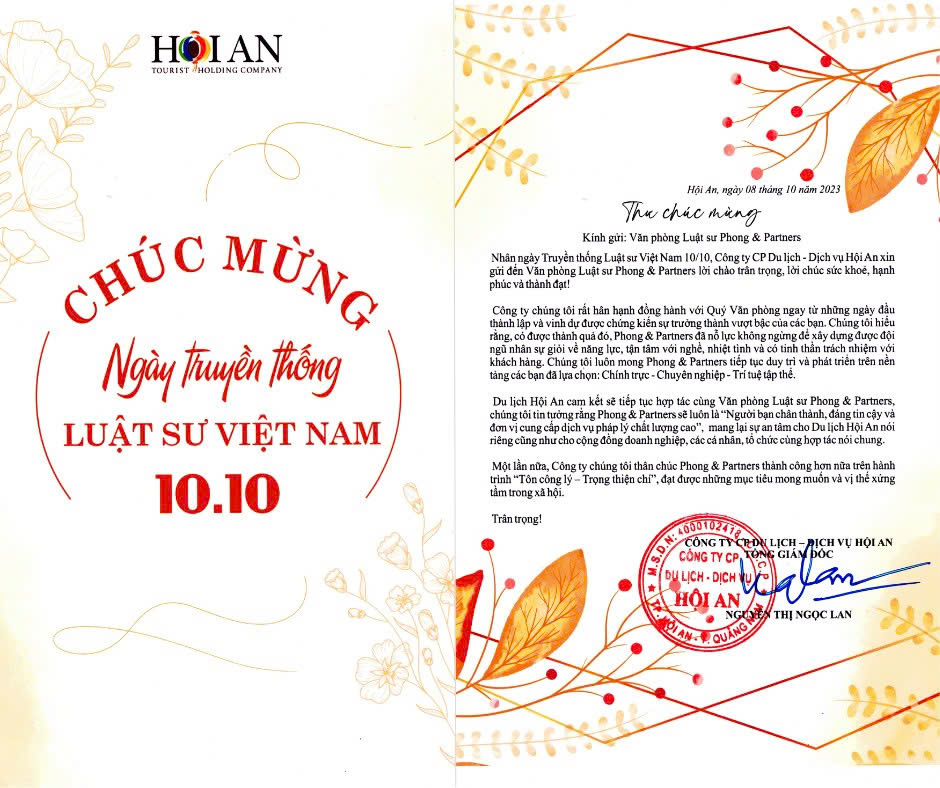 Du lịch Hội An cam kết sẽ tiếp tục hợp tác cùng Văn phòng Luật sư Phong & Partners, chúng tôi tin tưởng rằng Phong & Partners sẽ luôn là “Người bạn chân thành, đáng tin cậy và đơn vị cung cấp dịch vụ pháp lý chất lượng cao”, mang lại sự an tâm cho Du lịch Hội An nói riêng cũng như cho cộng đồng doanh nghiệp, các cá nhân, tổ chức cùng hợp tác nói chung.”