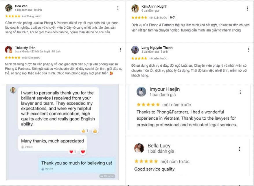 Những đánh giá tích cực từ khách hàng và đối tác không chỉ là sự ghi nhận cho nỗ lực bền bỉ của Phong & Partners, mà còn là động lực để đơn vị không ngừng nâng cao chất lượng dịch vụ, mở rộng phạm vi hoạt động, khẳng định vị thế trên thị trường pháp lý Việt Nam và từng bước vươn tầm quốc tế.