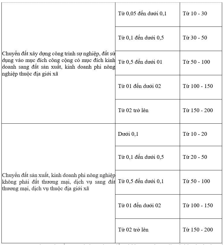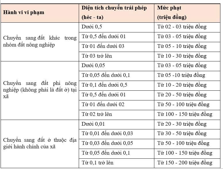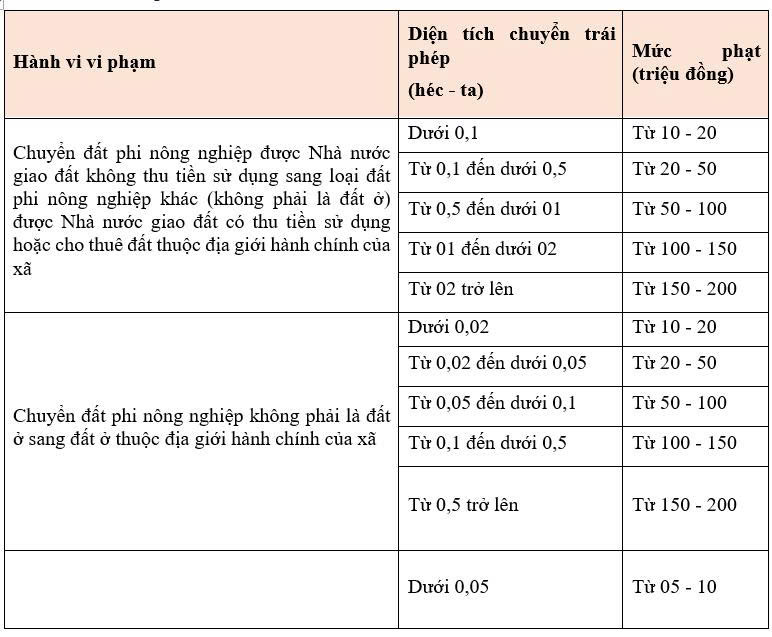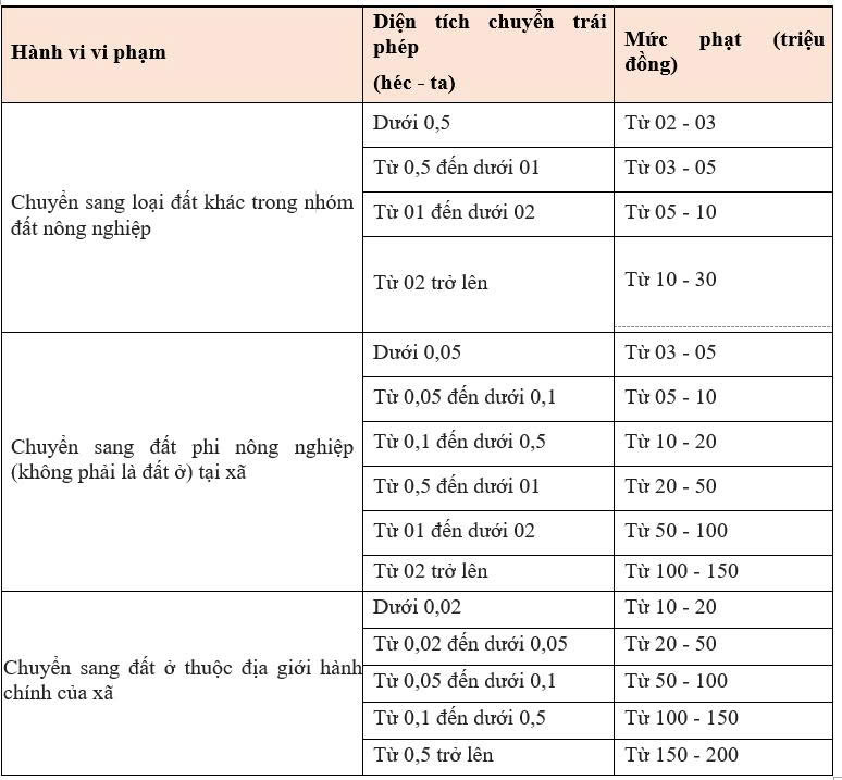 Lưu ý: Trường hợp chuyển đất nông nghiệp không phải là đất trồng lúa, không phải là đất lâm nghiệp sang đất phi nông nghiệp thuộc địa giới hành chính của phường, thị trấn thì mức xử phạt bằng 02 lần mức phạt tương ứng.