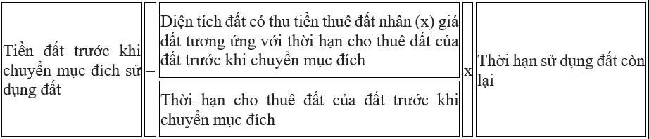 + Đối với đất trước khi chuyển mục đích là đất nông nghiệp được Nhà nước cho thuê đất theo hình thức trả tiền thuê đất hằng năm thì tiền đất trước khi chuyển mục đích sử dụng đất bằng không (= 0).