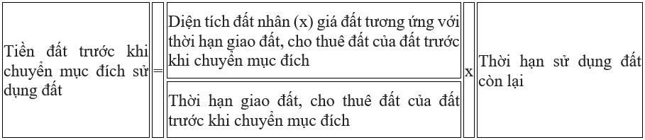+ Đối với đất trước khi chuyển mục đích là đất nông nghiệp của hộ gia đình, cá nhân được Nhà nước giao đất không thu tiền sử dụng đất hoặc là đất nông nghiệp có nguồn gốc nhận chuyển nhượng hợp pháp của hộ gia đình, cá nhân khác đã được Nhà nước giao đất không thu tiền sử dụng đất thì được tính như sau: Tiền đất trước khi chuyển mục đích sử dụng đất = diện tích đất nhân (x) với giá đất của loại đất nông nghiệp tương ứng trong Bảng giá đất.